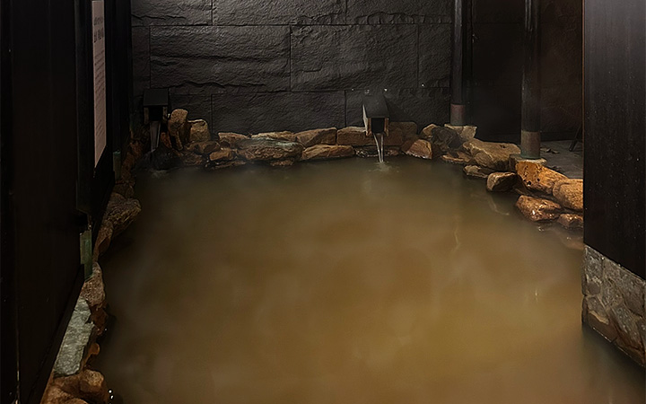 「金泉」露天風呂、赤茶色でとろりと濁った泉質が特徴。